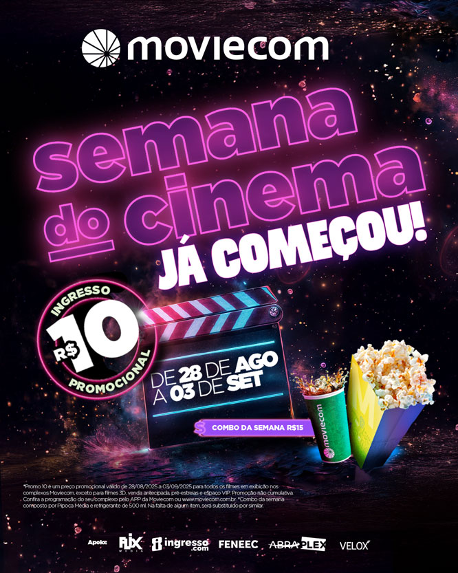 *Válido para todos os filmes em exibição nos complexos Moviecom durante o período de 28/08 a 03/09/25, exceto para filmes 3D, venda antecipada, pré-estreias e espaço VIP. Promoção não-cumulativa. Consulte o regulamento completo no app.
