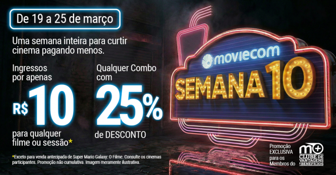 De 19 a 25 de março, clientes do Clube de Vantagens e Benefícios Moviecom+ de todos os níveis (Boas-vindas, Blue, Black ou Prime) podem assistir a qualquer filme em qualquer sessão pagando apenas R$ 10 no ingresso*. Não faz parte do Moviecom+? Cadastre-se agora, é grátis e você pode ter acesso a esse e muitos outros benefícios!